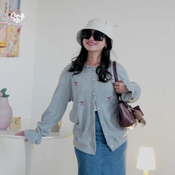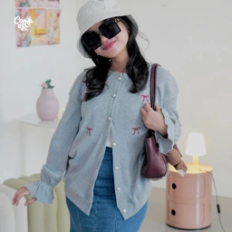 • Cardigan multiways, punya detail ruffles di lengan, dan crystal button premium